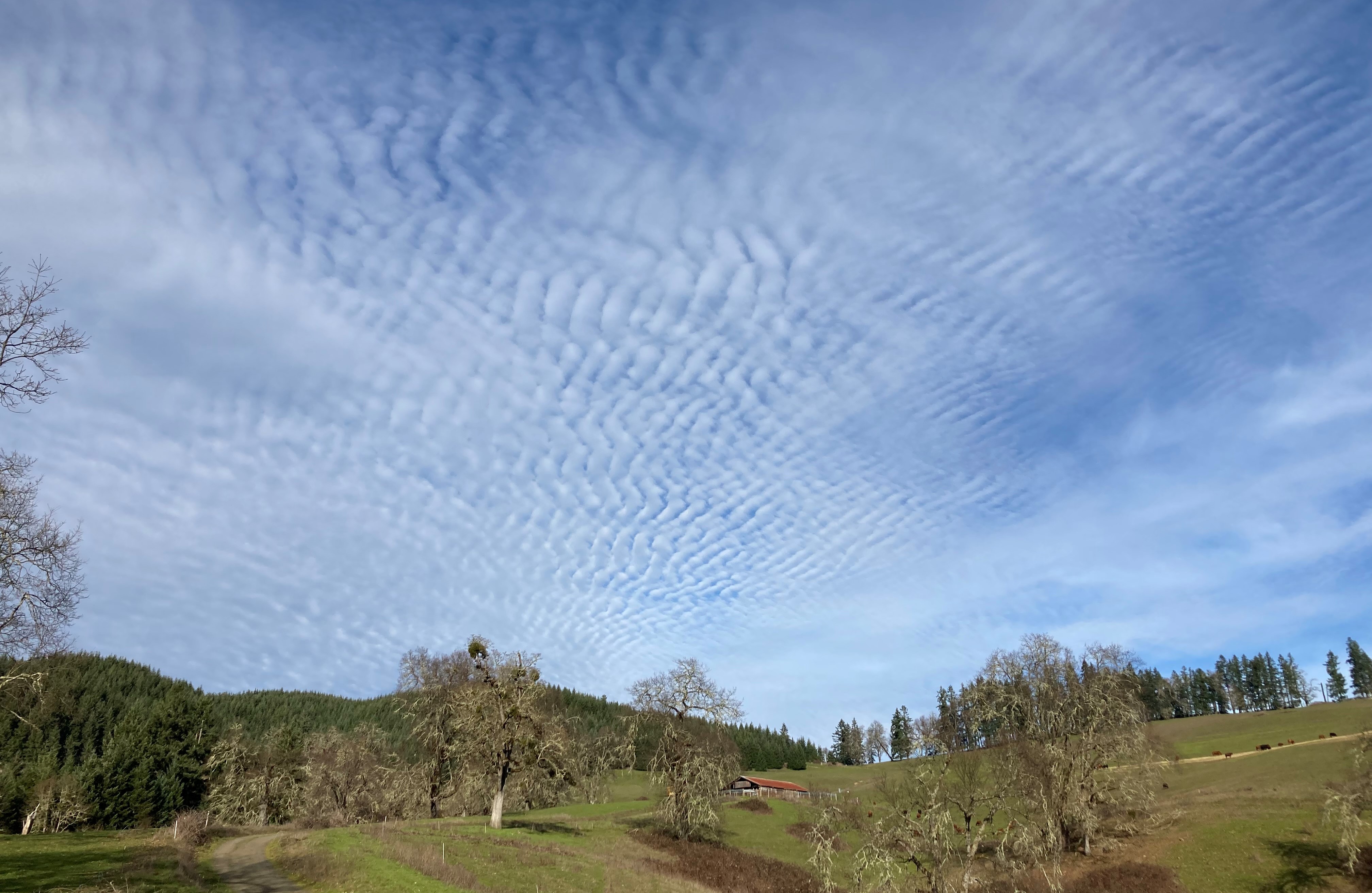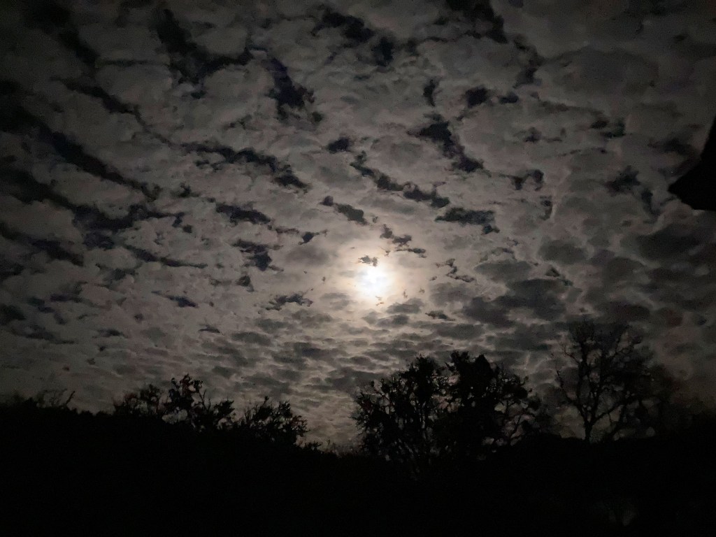 Around ten o’clock I looked out the window and saw a mysterious pattern of clouds still spread across the sky, lit then by the rising moon. I turned out the house lights to see them better. Then knew I must go outside for the full effect.