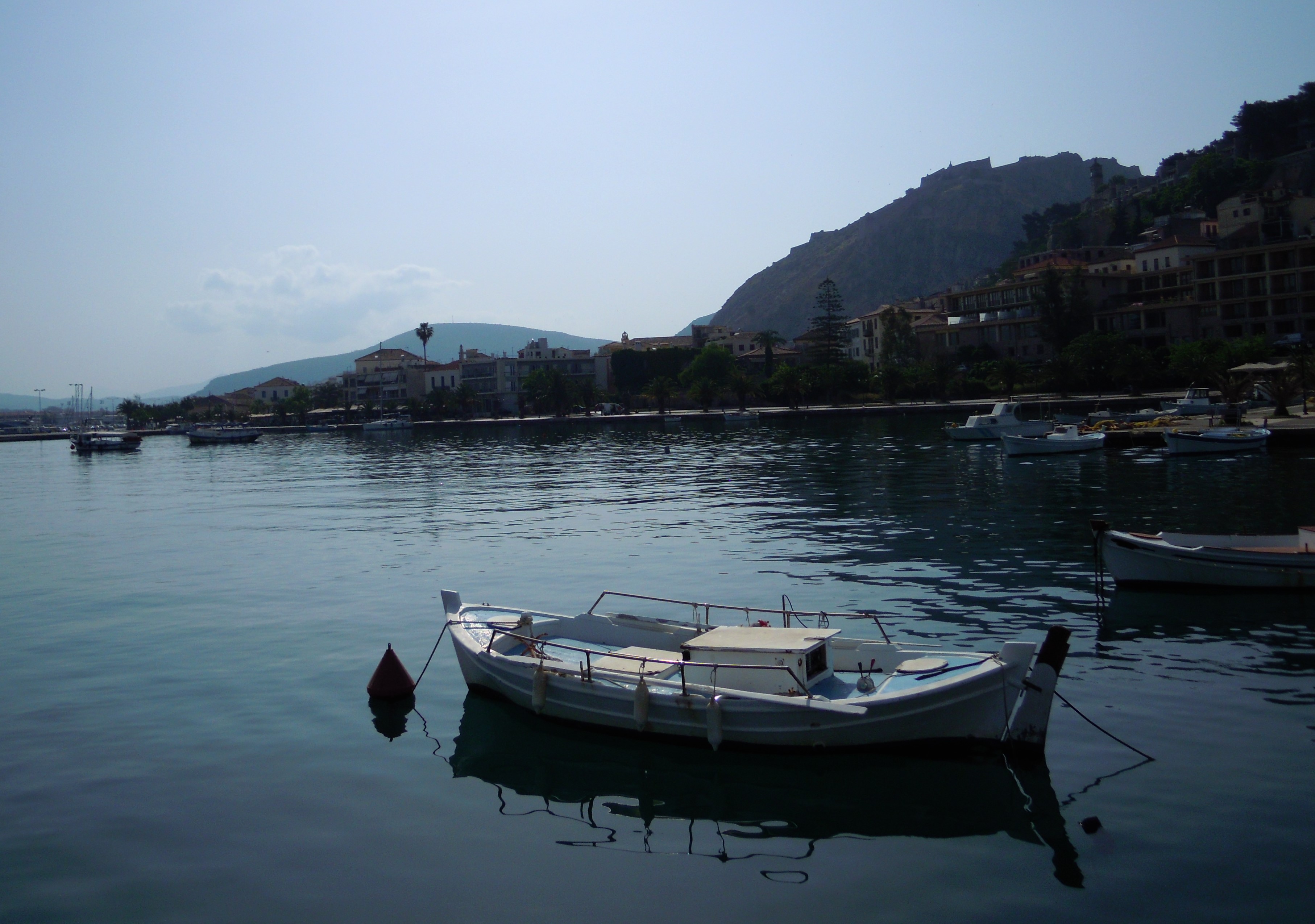 My destination was the beautiful city of Náfplio on the Greek mainland, a port in the Peloponnese region today as it no doubt was in Mycenaean times. For my books I call the city Tiryns, naming it for the ancient citadel of Tiryns just north of the docks. With the single square sails of their wooden ships they would have sailed into port in the place shown below. Just envision that boat in the picture a little larger, put a square sail on it, with rowers on either side, and you have the image. A number of my book scenes happen in this port town and I planned several days here.