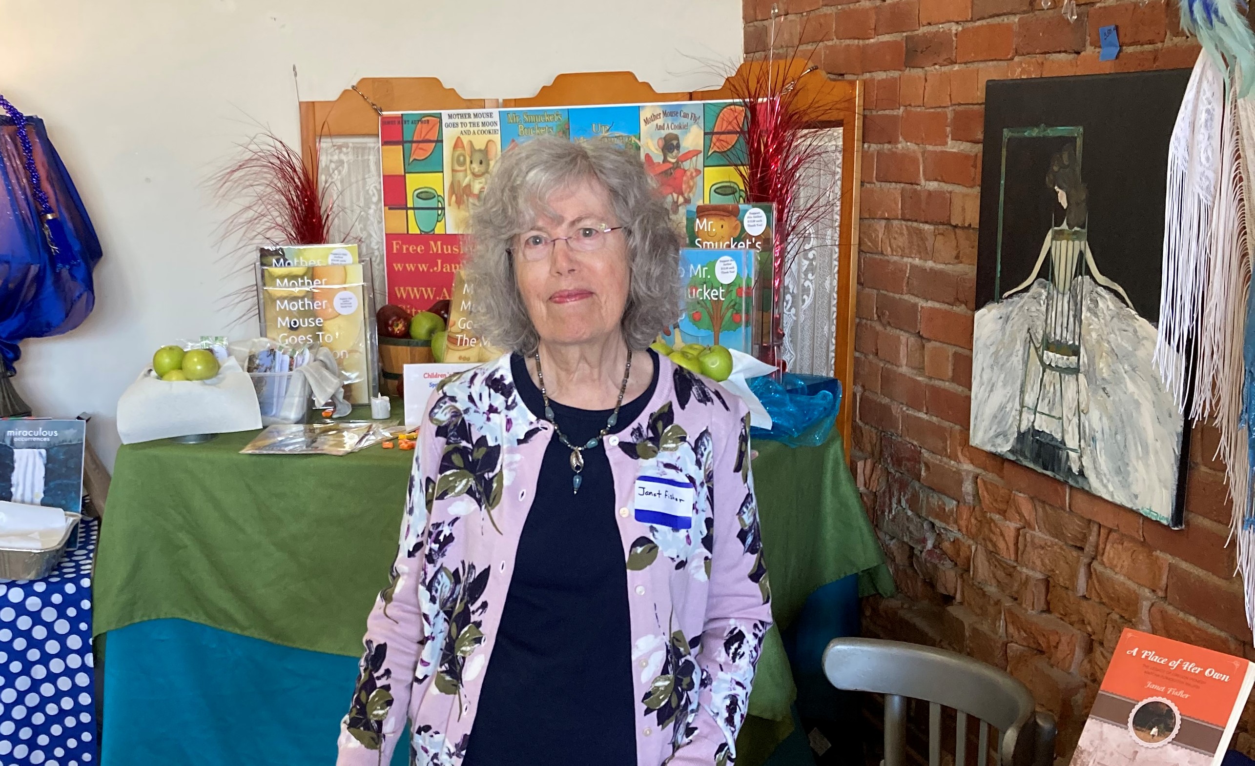 Me at my table next door to Jim Hart’s display of his delightful children’s books. I believe he was in the next room with his guitar offering music at that moment.