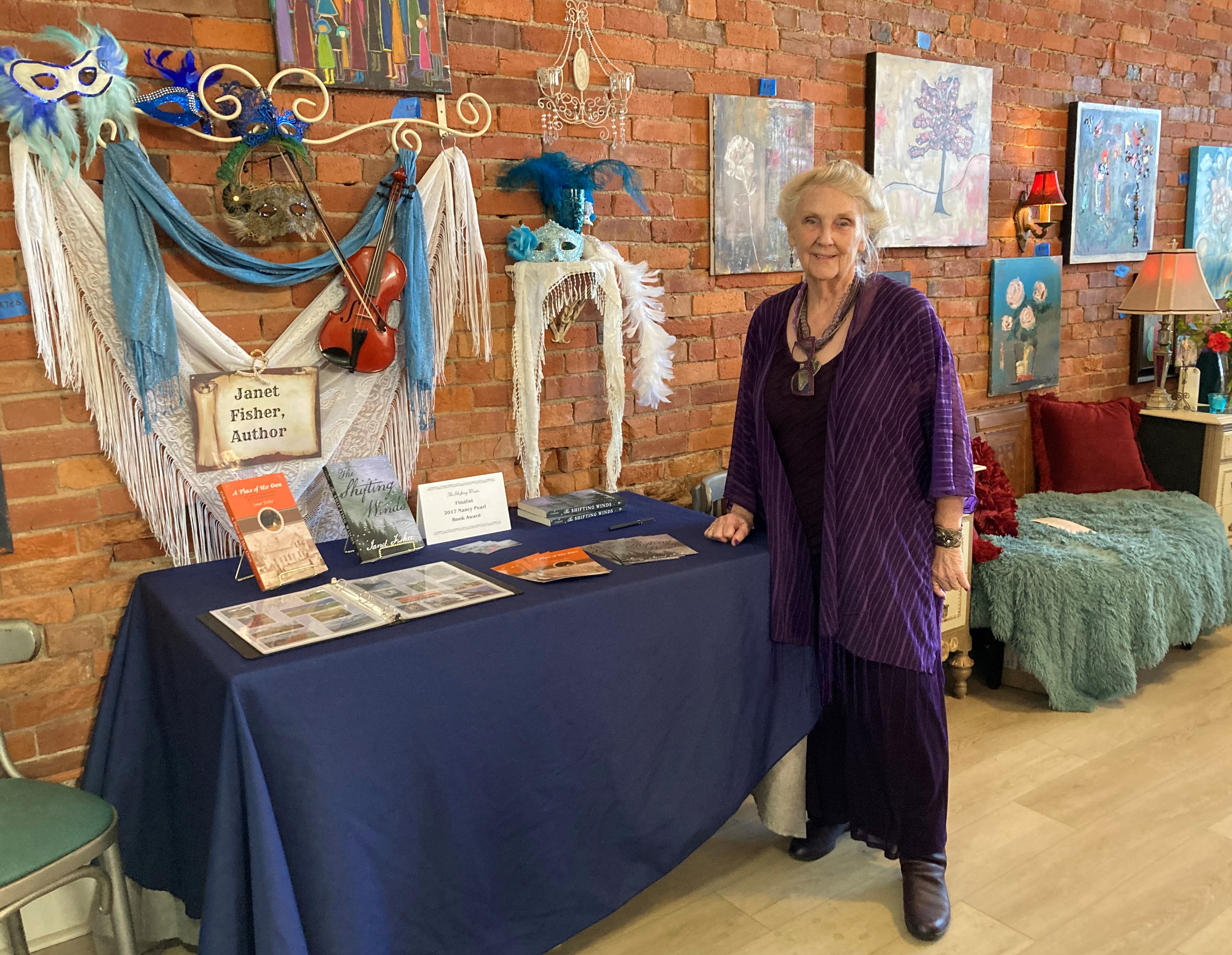 Here’s Conni in the photo below next to my table where I sold and signed books, A Place of Her Own and The Shifting Winds, my Oregon pioneer stories. Also on the table is a book of photos, including pictures of Ireland, setting for my next book. Conni did the beautiful display above the table, adding my “Author” sign to her decor, a sign I have used since I received it from the Oaklanders who made it for me at an event they sponsored some years ago. I especially loved the violin. Nice touch.