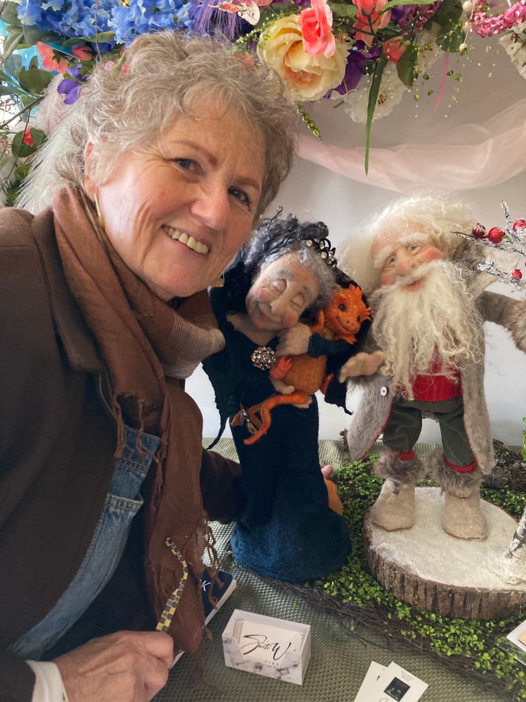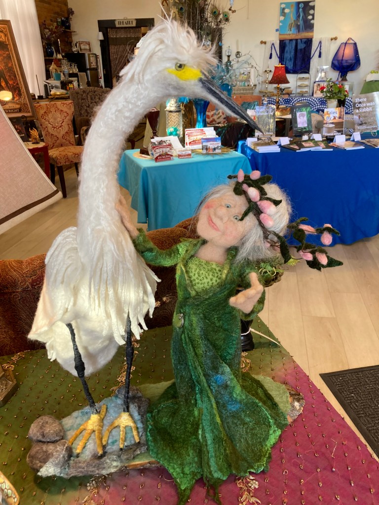Carolyn’s book displays 50 of these characters in full color with enchanting stories for each one. She has made each character by hand (in fact she was working some wool during the event to show the process). I’m not good at estimating sizes but I would guess they’re about two feet tall. The books are available on Amazon.