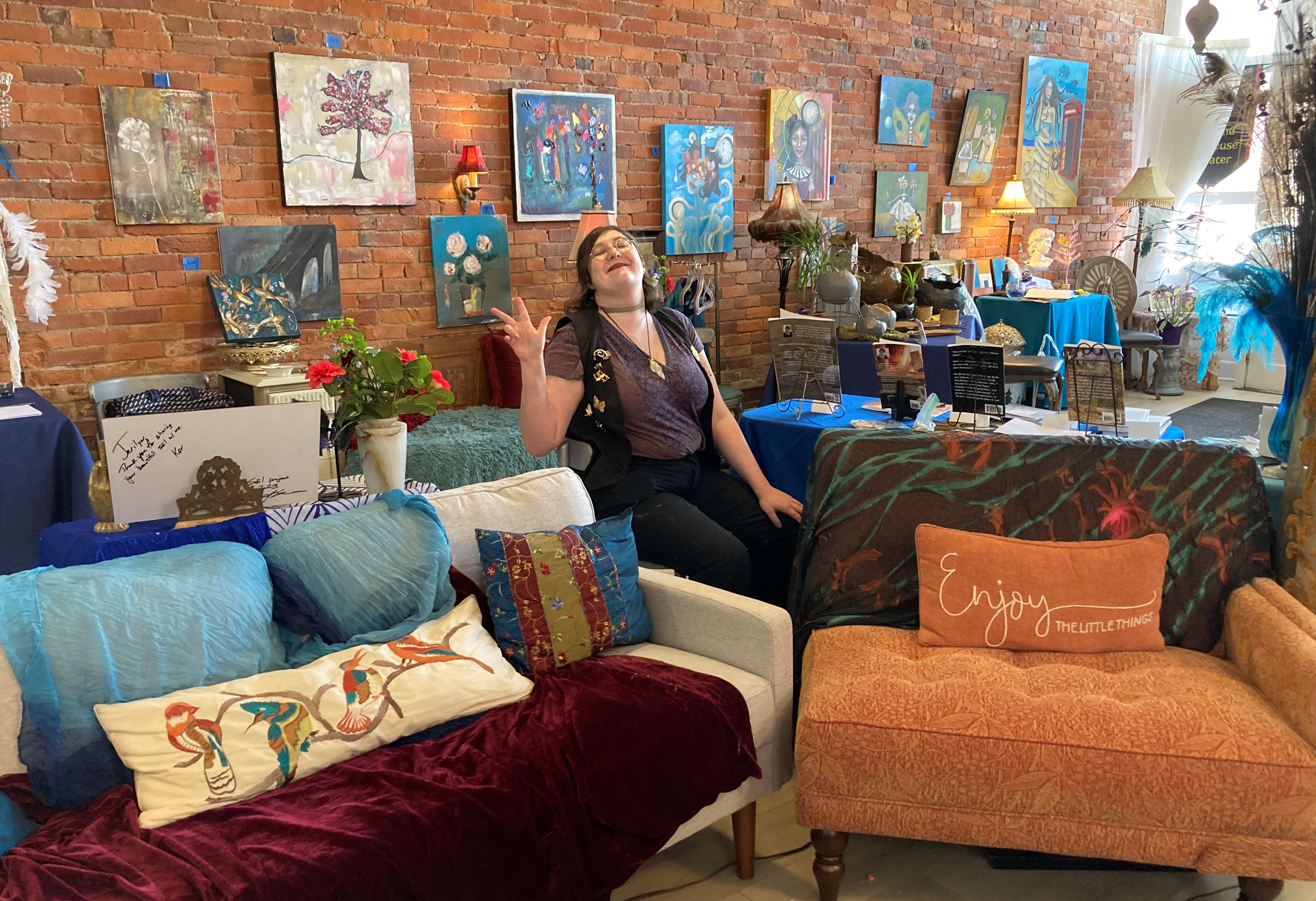 And for a wide look at the room here’s Elaesa Jones, below, a young author with unbounded energy and enthusiasm, with a collection of her books, There Once Was a Rabbit, Tales by the Fire, and many more. She loves magic and delving into fantastical realms for her stories. I found her online by going directly to “elaesa jones books.”