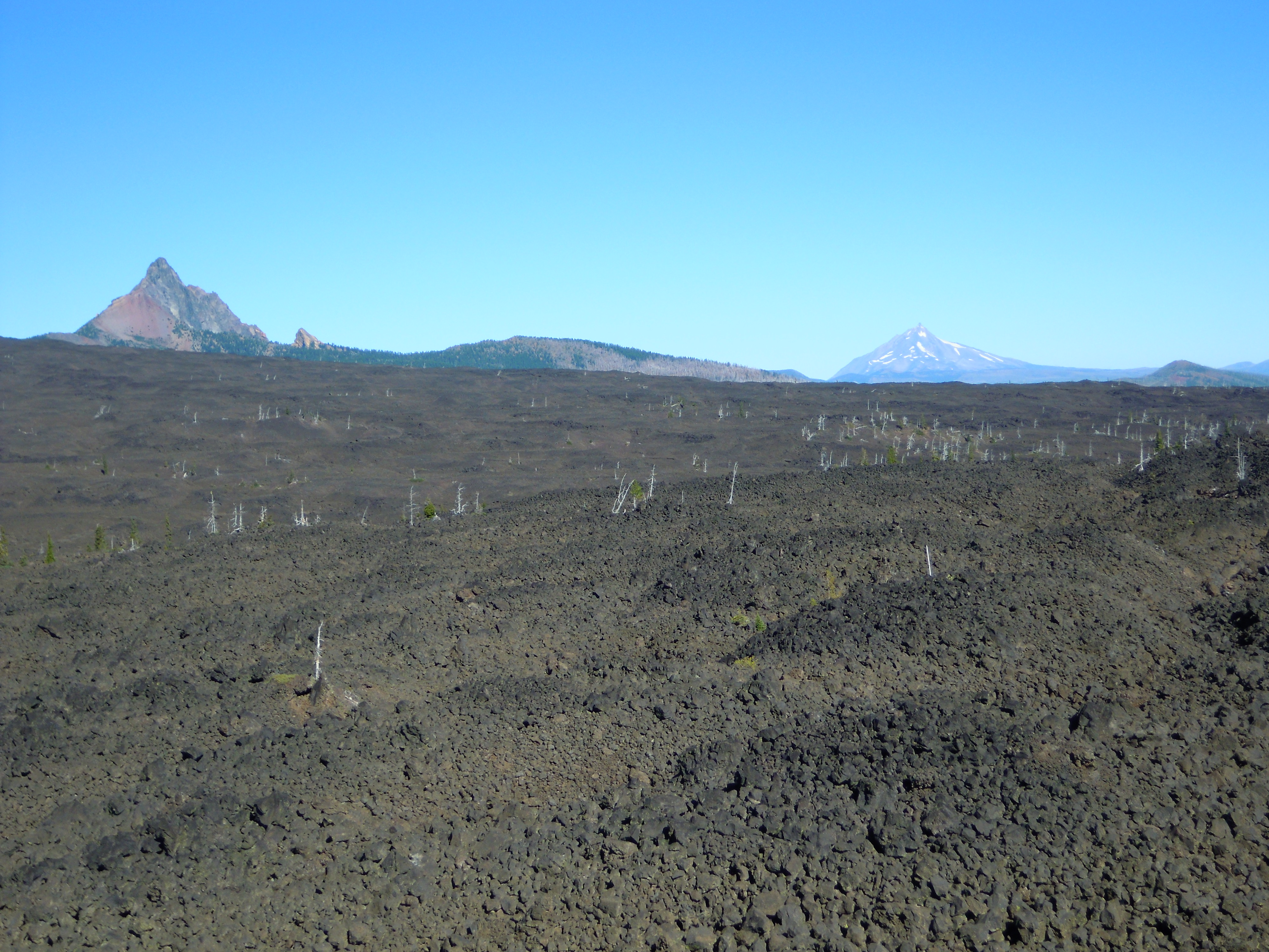 Beyond the lava beds Mount Washington rises in a jagged point on the left and Mount Jefferson forms a snow-laced cone in the distance on the right.