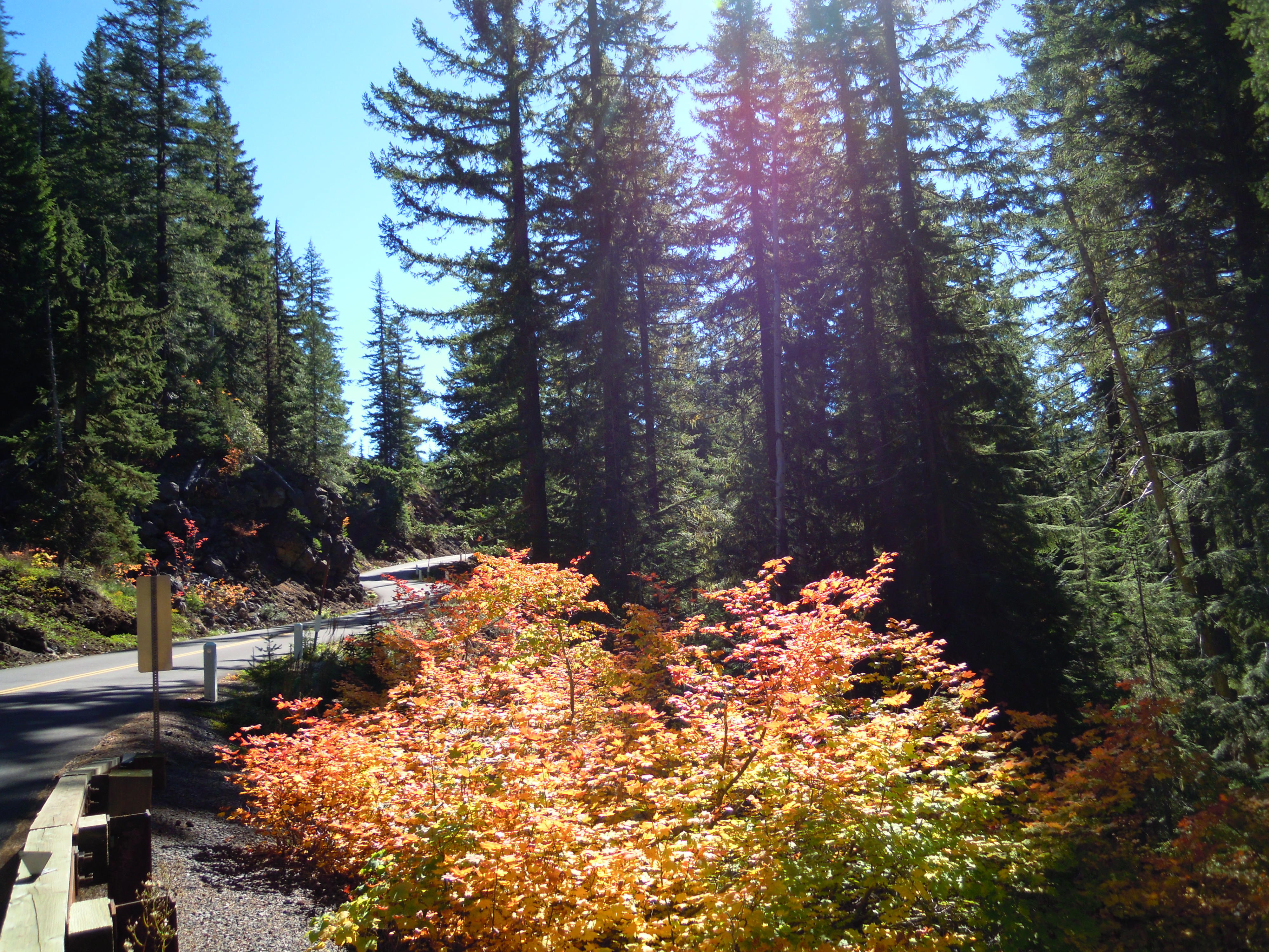 Finally, coming down the twisting route into the thicker woods of the western side of the mountains (below), a spray of sunlight seems to breathe the fire of life into the vine maple.