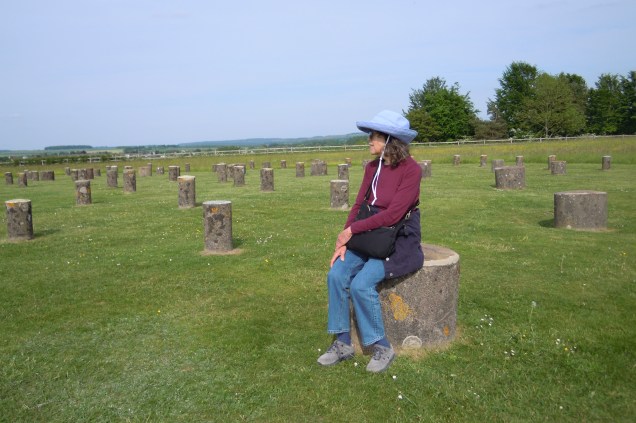 Now we’d spent so long at Stonehenge we gave up on Avebury, but as we sat resting in our room at the delightful Fairlawn Hotel in Amesbury we decided to take an evening stroll to Woodhenge, a satellite site within easy walking distance. We were surely up to a pleasant walk out through the edge of the lovely town. We didn’t account for traffic that buzzed along beside us like freeway traffic on a narrow road, so close to the sidewalk I felt as if a wobble would put me right in a car’s path. But we survived to see this unusual site. A quiet, peaceful place.