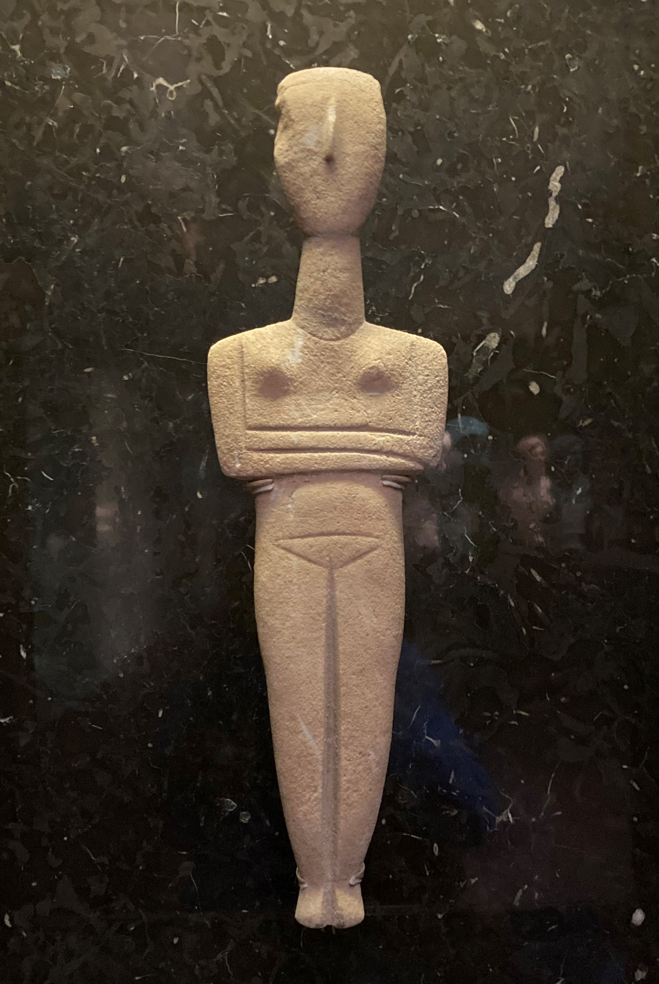 From knights in armor we swept way back in time to this figurine, which may have represented the Mother Goddess worshiped across Europe and into Asia from the Paleolithic to the Bronze Age. This one, created in marble, is in the museum’s Greek collection from the Cyclades, mid-third millennium B.C. The museum literature suggests that due to the sexual emphasis the figure may have represented fertility. Since such figures are often found in tombs it might have been placed there to help the dead reach the next step in life’s continuing cycles, that of rebirth. I present similar beliefs in my upcoming stories of ancient Ireland and Crete. So I was excited to see this.