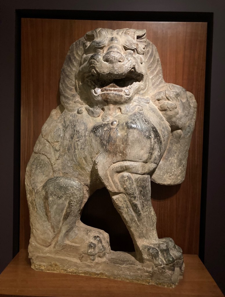 And Asian art. See the Guardian Lion below. Another picture I should have taken with Aspen nearby to show its size. I’m guessing he’s about five-foot tall. He’s from the Tang Dynasty, probably around 681 A.D., made of gray limestone. He’s impressive. If you take a close look you may see the graffiti carved into his legs. Even back then.