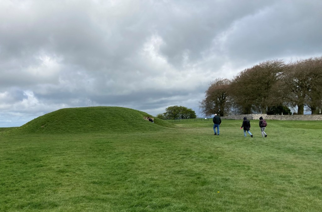The local guide split our group to take half at a time in the passage into the interior of the mound, while the other half were free to wander the site. Just what I had hoped. I wanted to wander around and get the lay of the land. What about my description from a ridge above? Well! There isn’t a ridge above. The mound lies on the ridge itself and the encircling pillar stones are much lower in the back, the kerbstones at the mound’s edge following the downward slope until they are completely covered with turf. The river is visible, but distant. Revisions I’ll need to make.