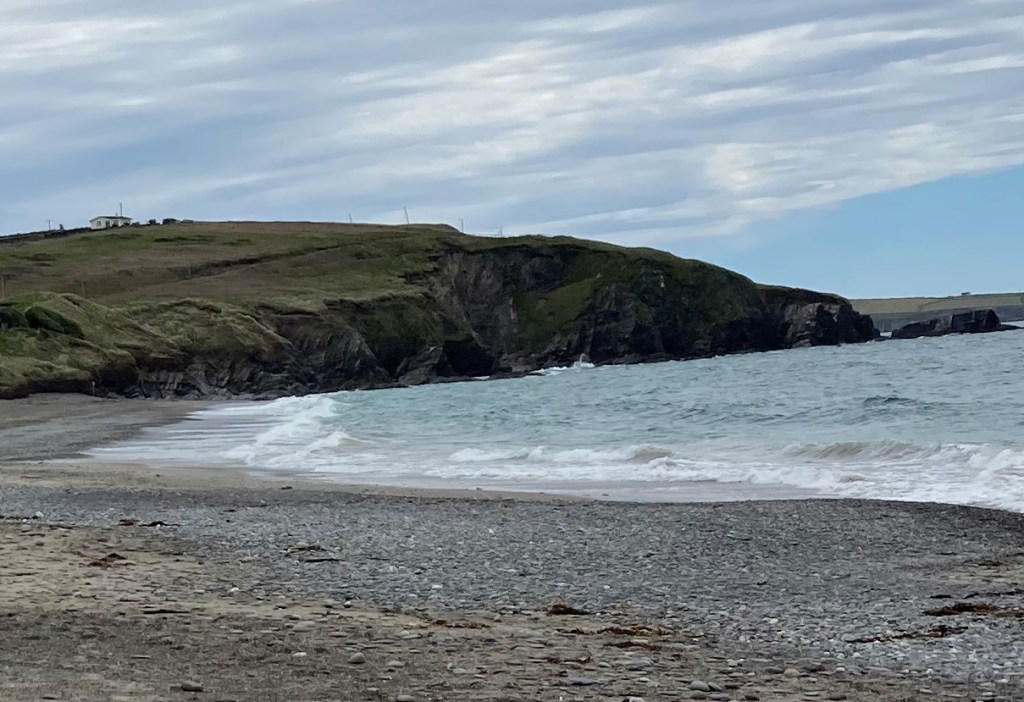 I had planned to call Finbarr to pick me up on that next beach when I was done with the Cliff Walk, as he’d suggested. He and Catherine insisted they drive me to and from the beach because they didn’t want me to walk across the dangerous highway that separated it from the B&B. But now I knew I had to go back to where I started and check out the bold promontory of Cloghna Head, which I now saw was the eastern headland of the full bay.