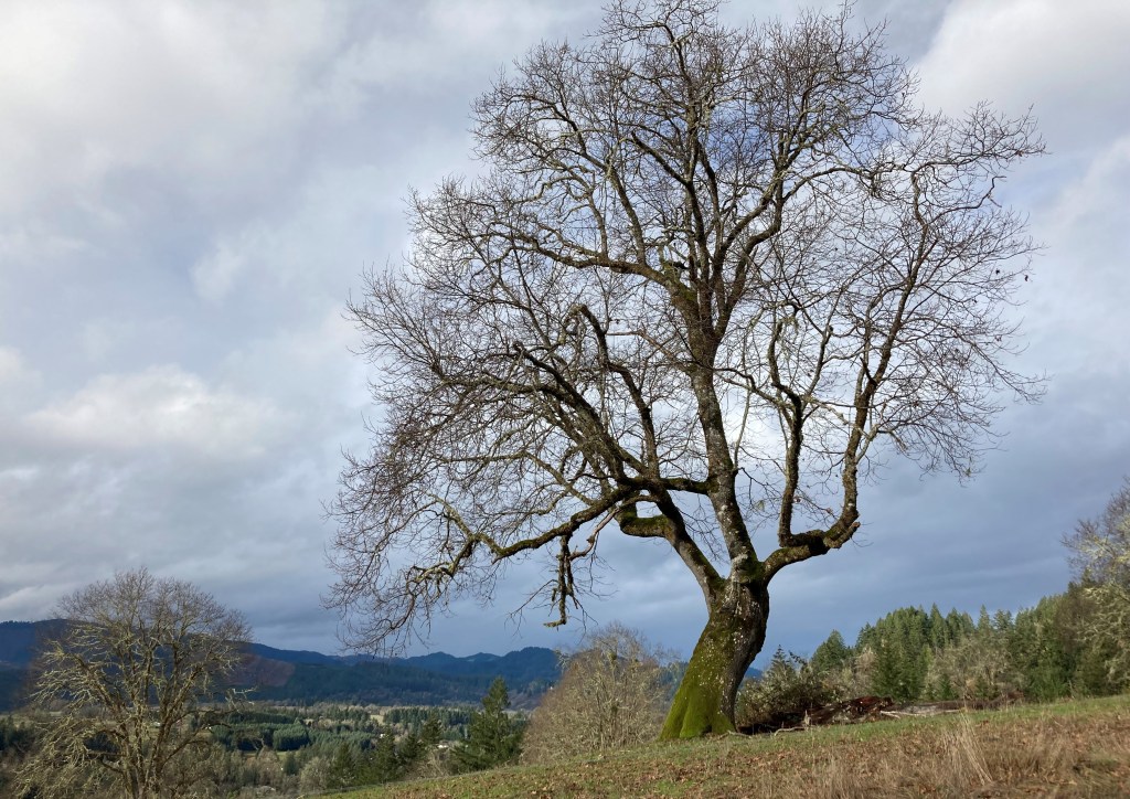 Yesterday was Winter Solstice and I went outside to try to capture a moment of the new morning light. Clouds covered much of the sky but left a few thinner spots where a bit more light promised to shine through. I kept thinking I had the most light I was going to get for a picture of this gnarly oak above my house who’s seen many a solstice morning in its long life. And I took one picture after another that wasn’t quite there.