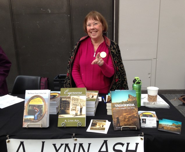 I was also delighted to see writer friends Valerie Brooks and Melissa Hart, who were there with their books. Valerie was the first person I remember meeting on my initial visit to the Mid-Valley Willamette Writers in Eugene, and she was always so welcoming. I met Melissa when she was a speaker at one of the meetings and appreciated how encouraging she was for my work. During the afternoon shift yesterday she joined the ring of tables where I was located, setting up right next to me. So good to see these friends again.