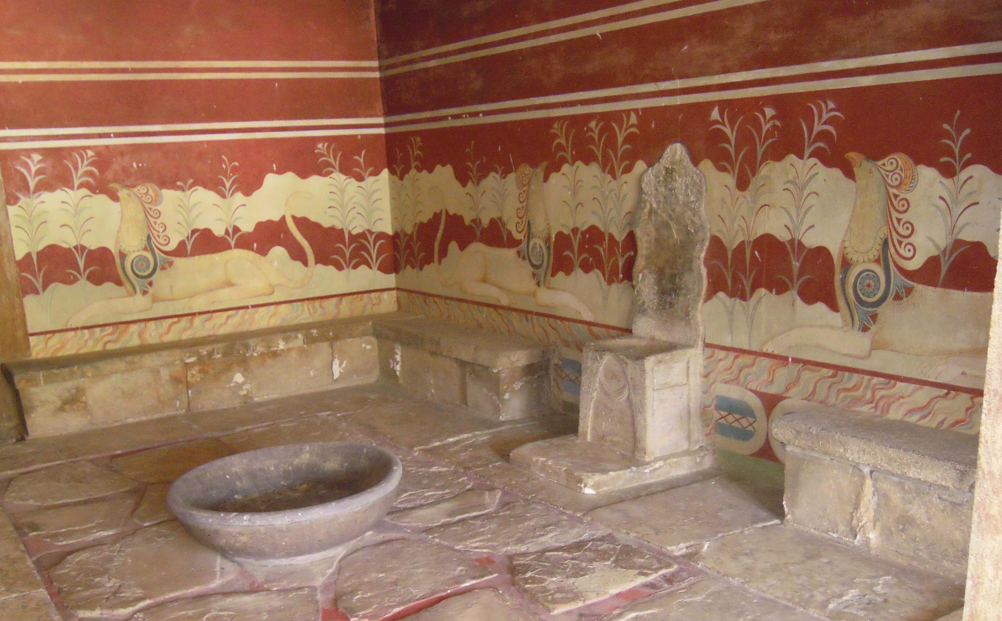 The throne room has been reconstructed with its frescoed griffins and small alabaster throne. It appears the throne would more likely fit a woman than a man, which led some to believe the leader of the people was a woman, achoice I made when I portrayed the leader as the high priestess. However, in my story she does accept a king, a warrior to help protect her people from threatening invaders.